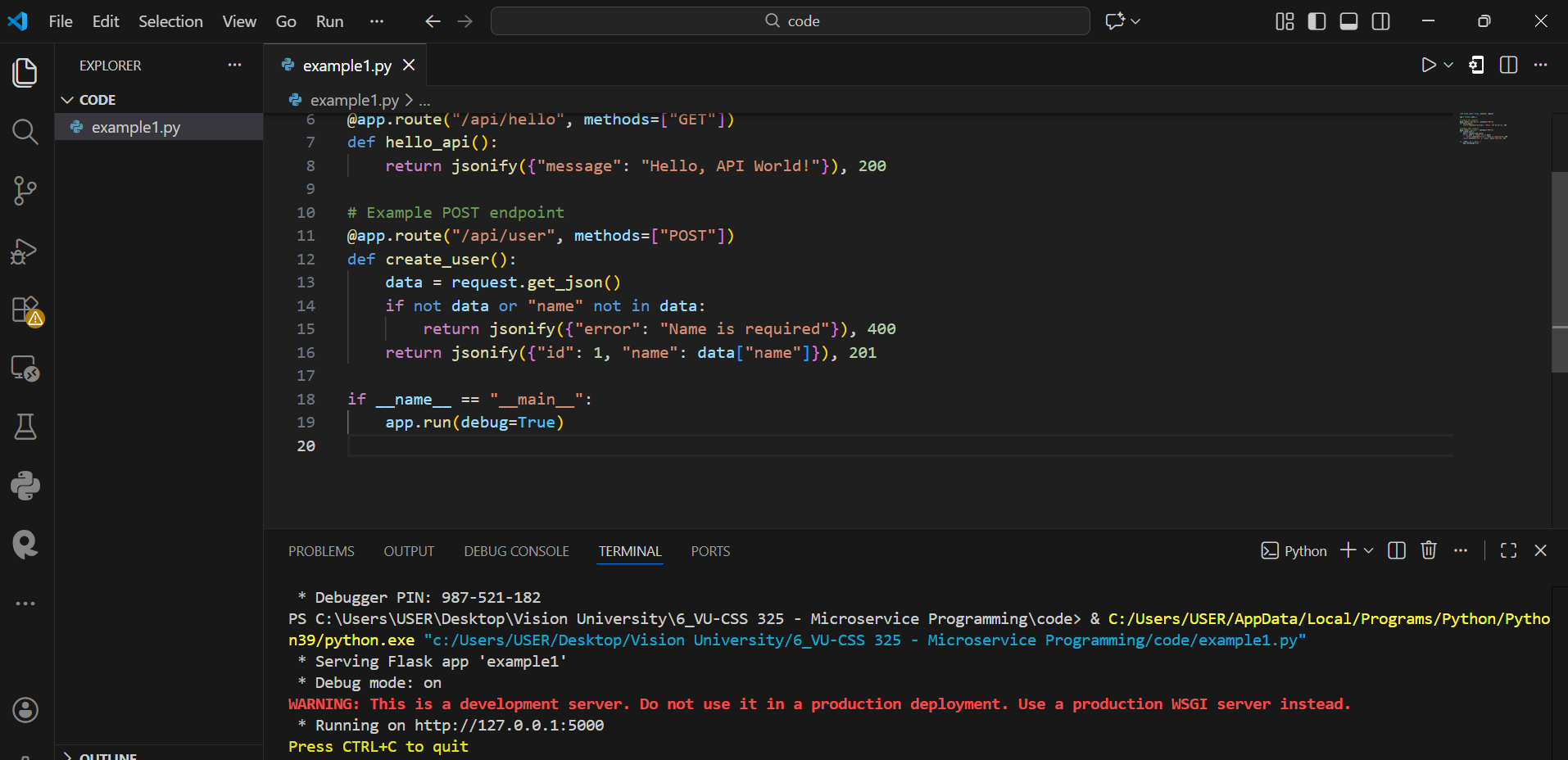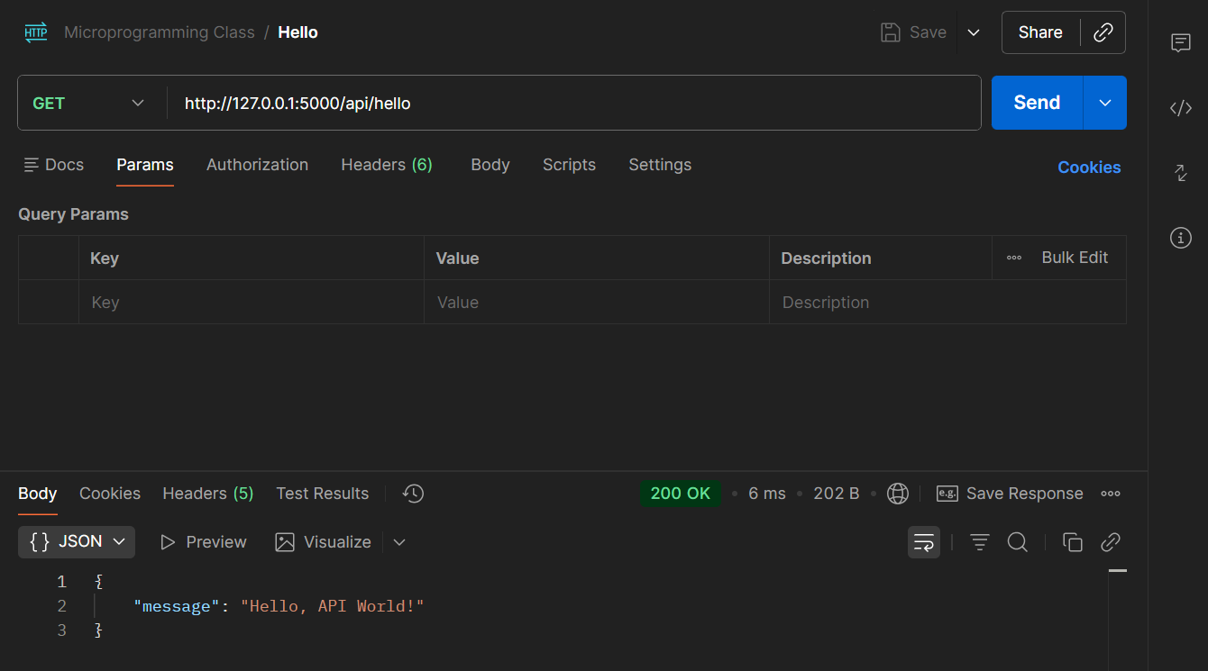 See the screenshot below to see how I use Postman to test this API end-points and see the responses I got. GET /hello endpoint (http://127.0.0.1:5000/api/hello)
