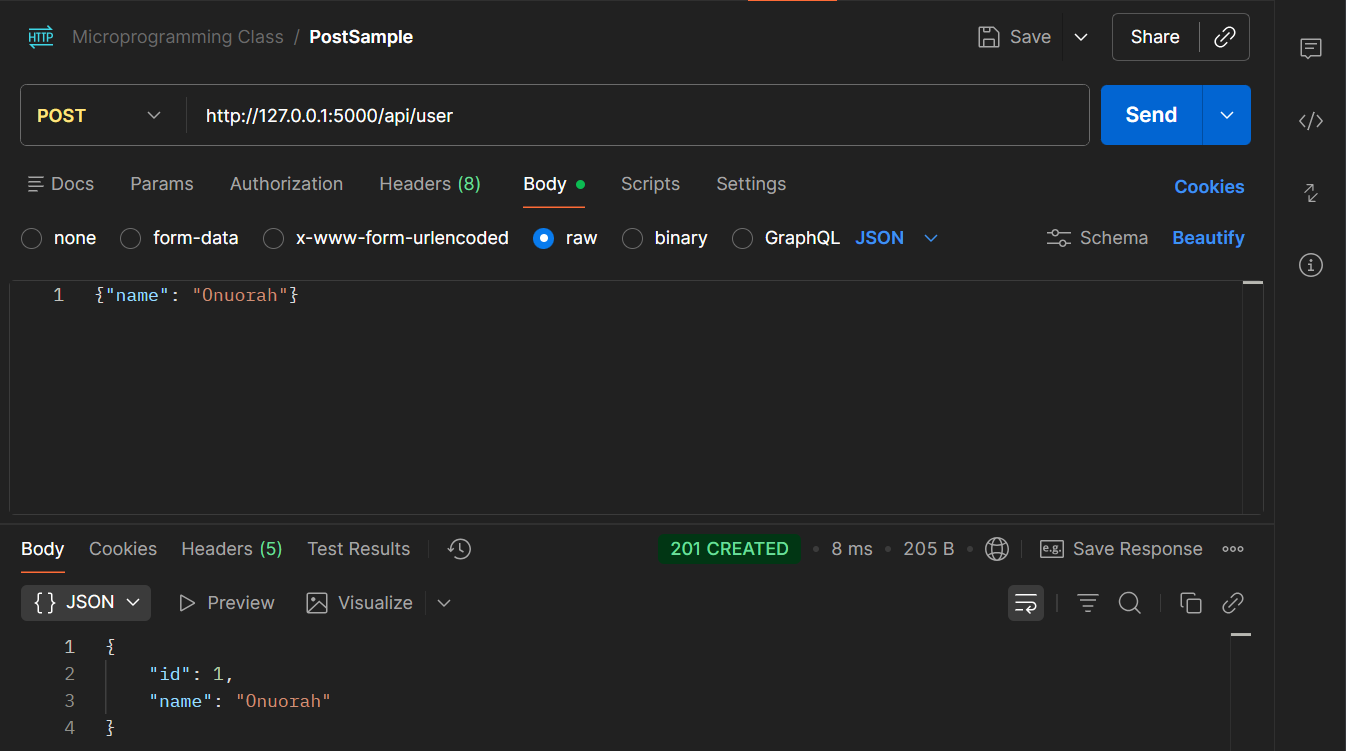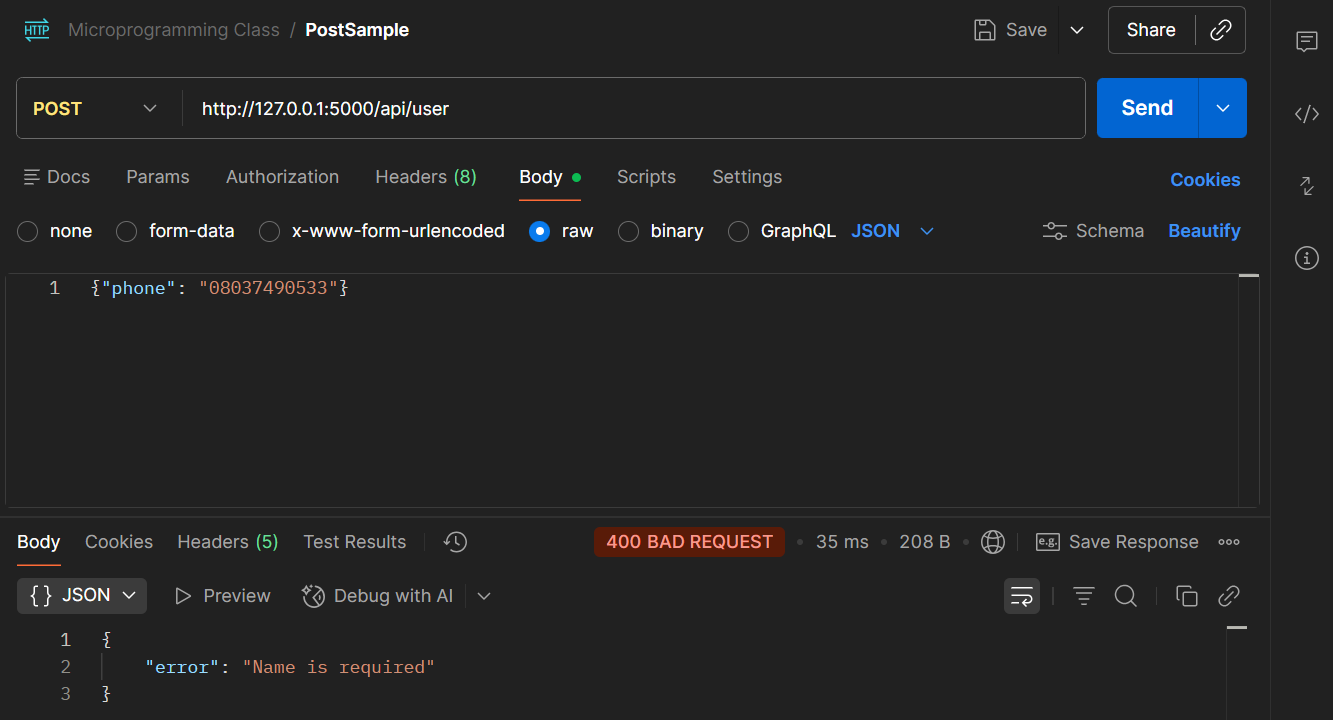 # Example POST endpoint @app.route("/api/user", methods=["POST"]) def create_user(): data = request.get_json() if not data or "name" not in data: return jsonify({"error": "Name is required"}), 400 return jsonify({"id": 1, "name": data["name"]}), 201