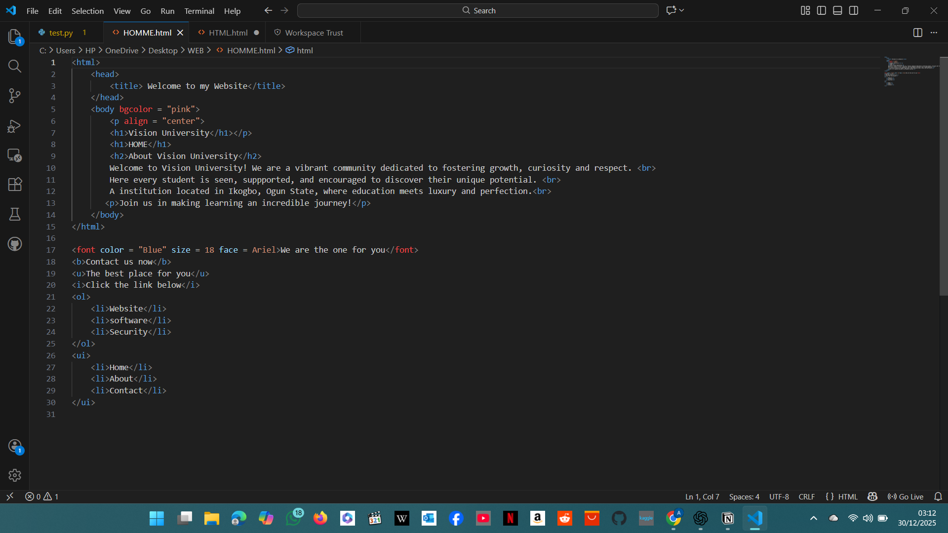 Open to your website folder and edit your web page e.g home.html in notepad or your prefered code editor as you did in the previous exercise.